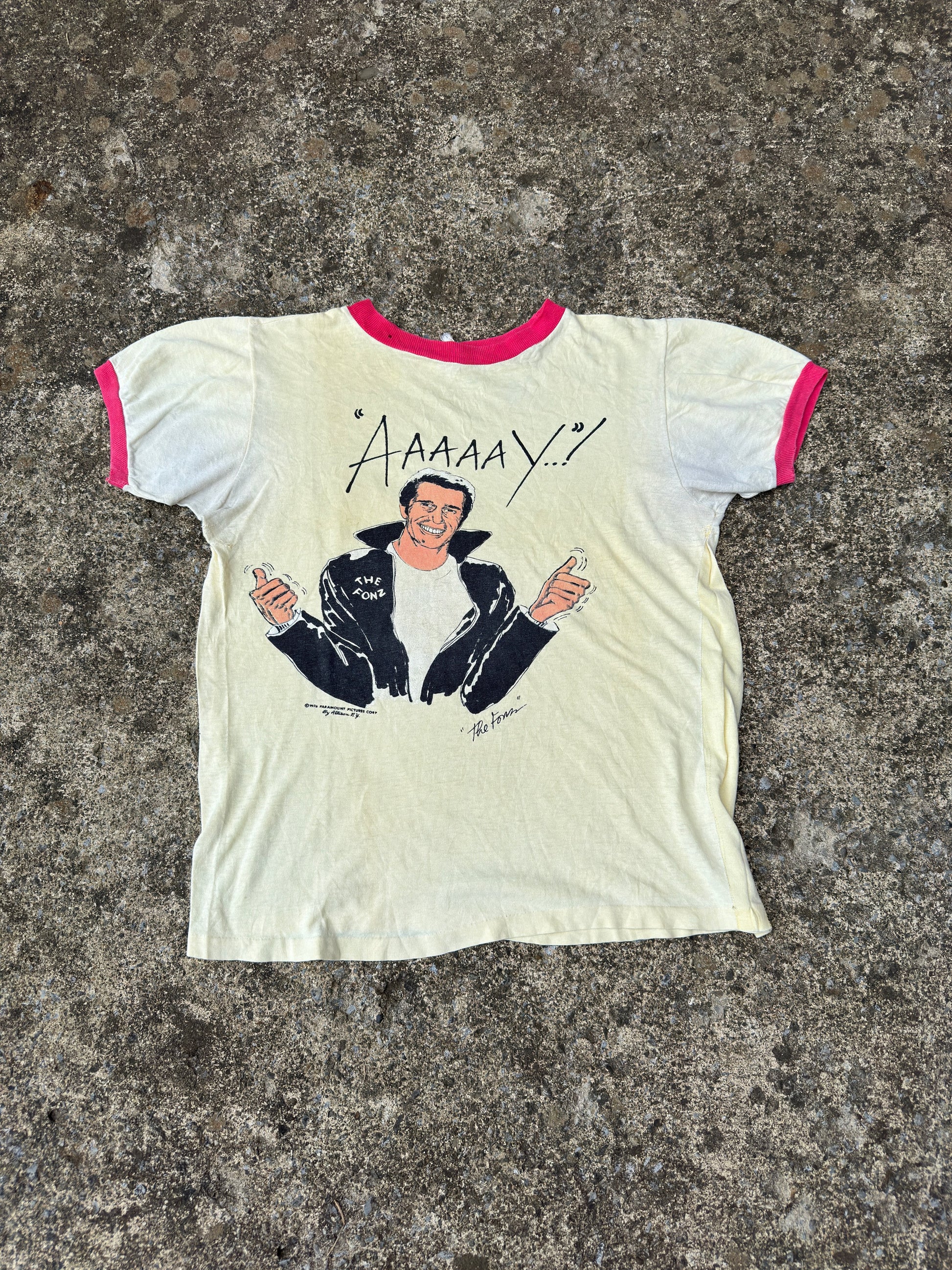 Sick 1976 the Fonz tee with large front graphic and red cuffs on the neckline and sleeve. Yellowing slightly but otherwise in great condition.