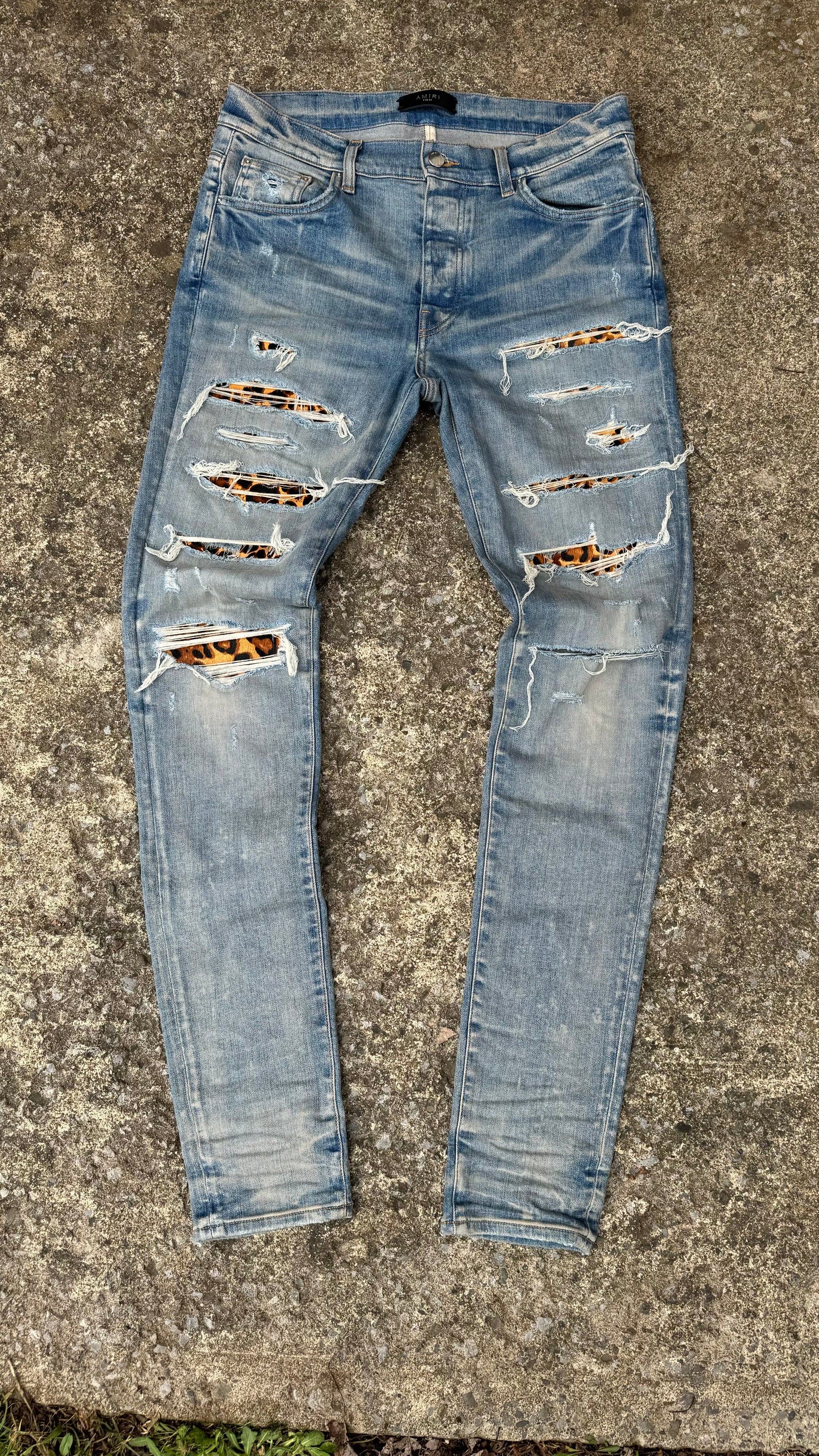 Insane pair of Mike Amiri denim's with distressing and cheetah print backing. In great condition, no damage or wear besides the intentional.