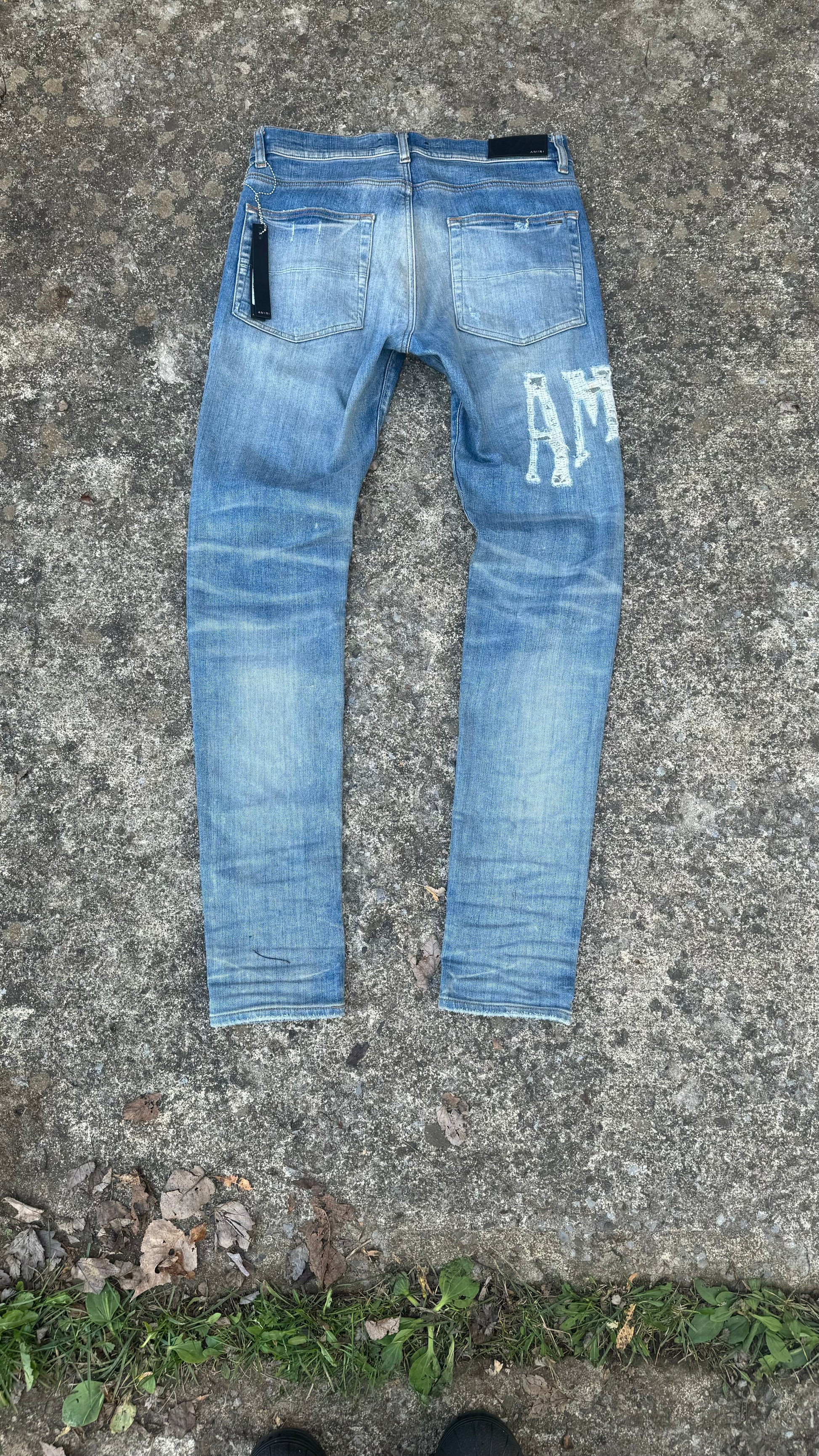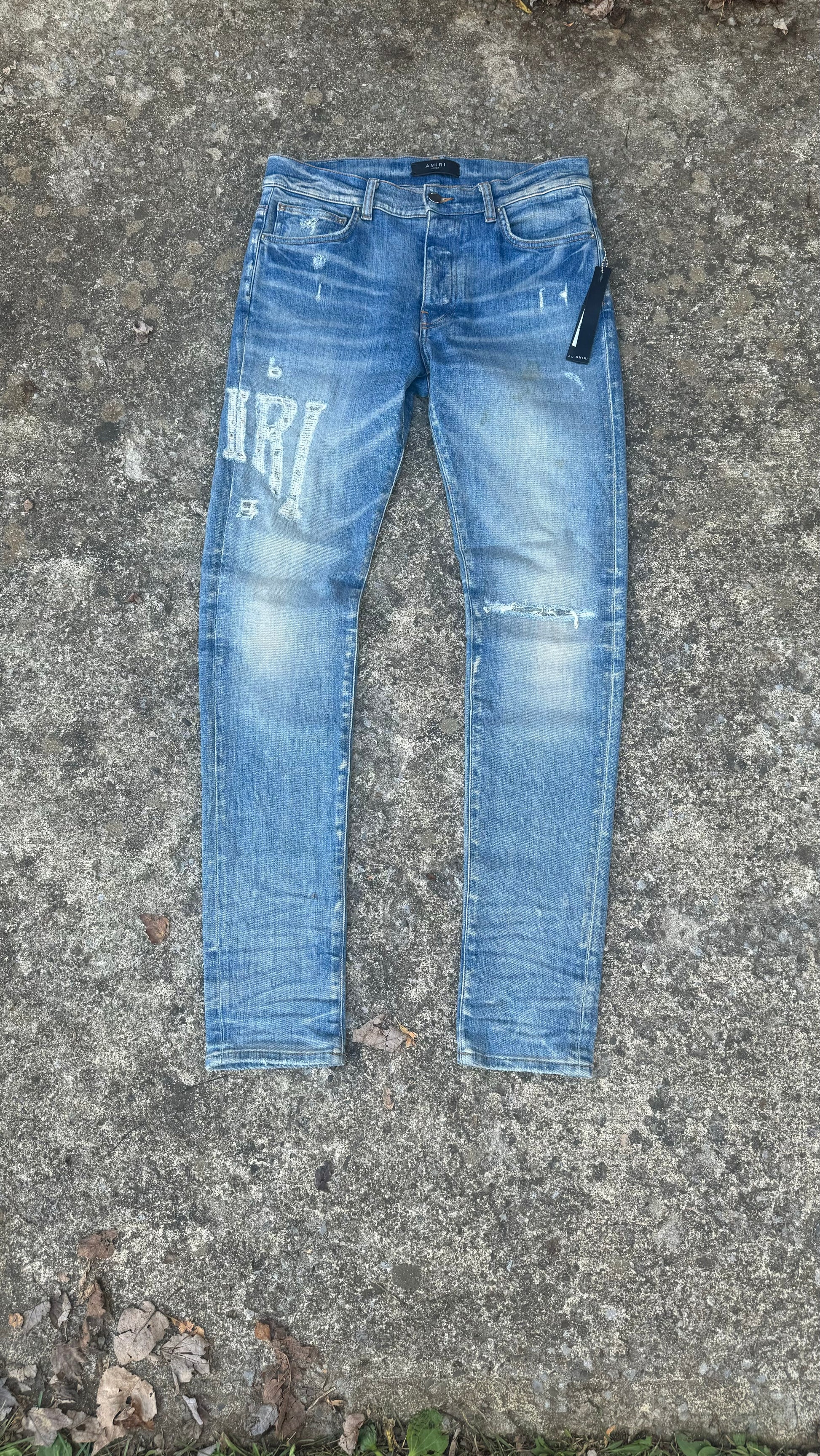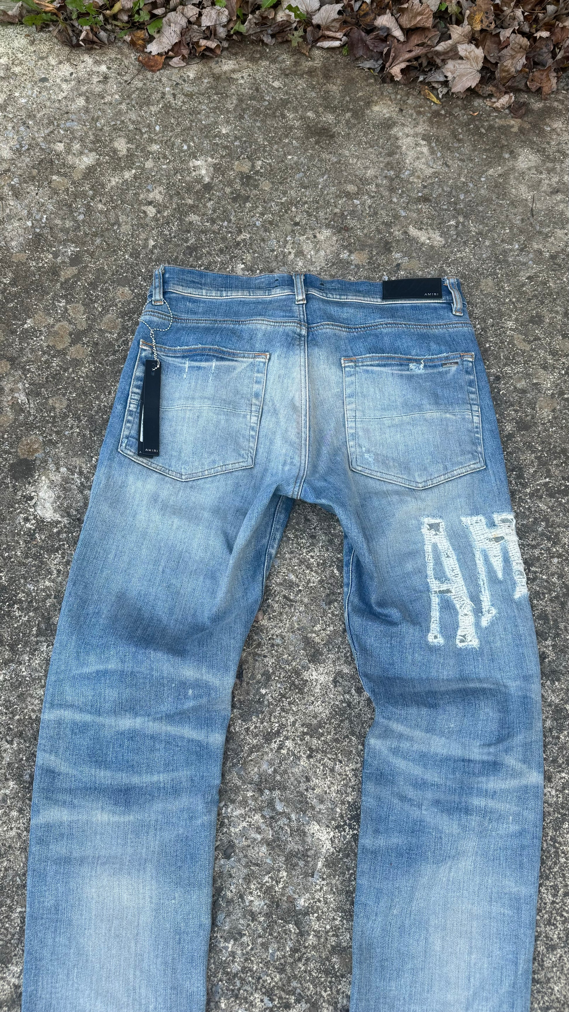 Sick pair of Mike Amiri's with distressed logo and lightwash faded denim. Basically unworn with tags still attached, no stains, damage, or wear visible.