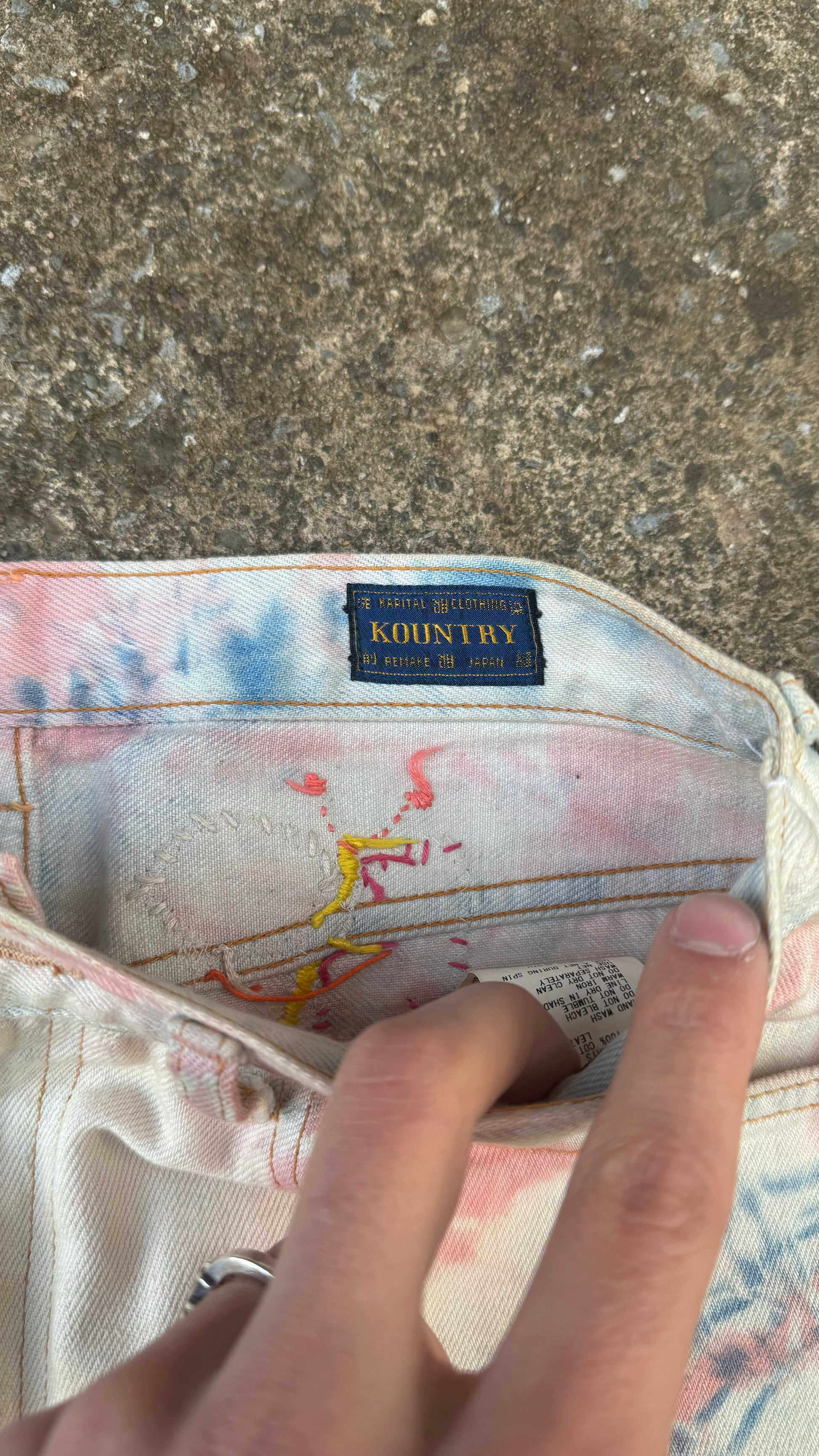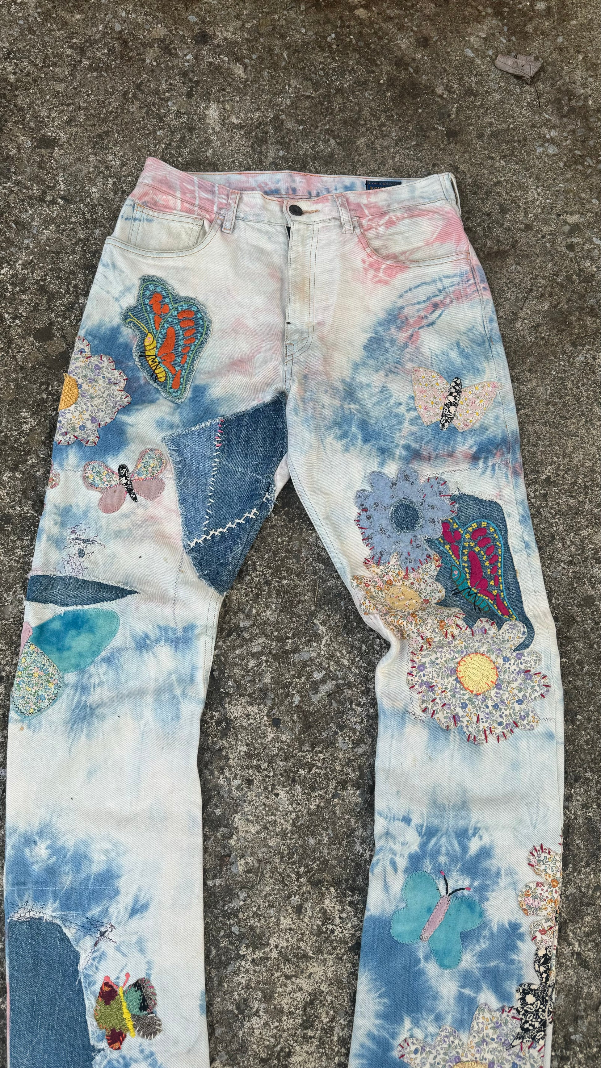 Beautiful pair of Kapital denims with tie-dye coloring, distressing, and patch repairs throughout. An extremely unique pair of jeans with extremely unique details, no stains or damage beyond the intentional.