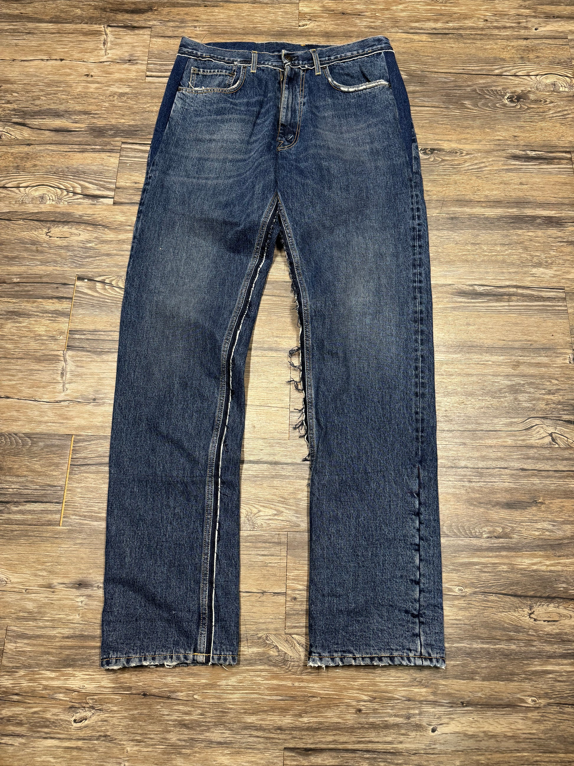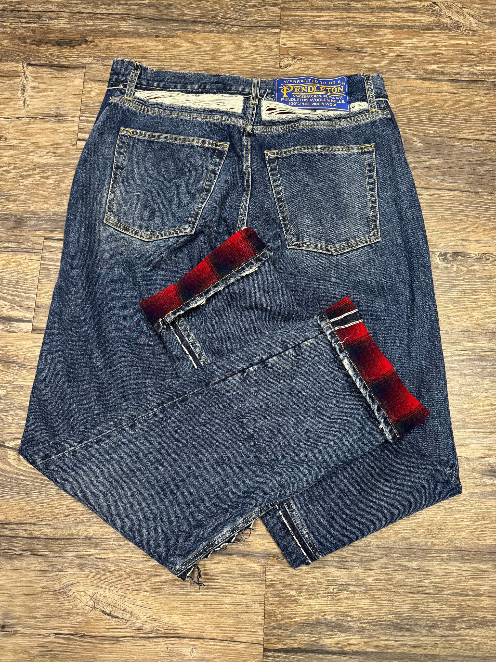 Insane pair of deconstructed selvedge denim from the Margiela x Pendleton collaboration. Lined with flannel with distressing details throughout, in basically perfect condition. Comes with original tags.