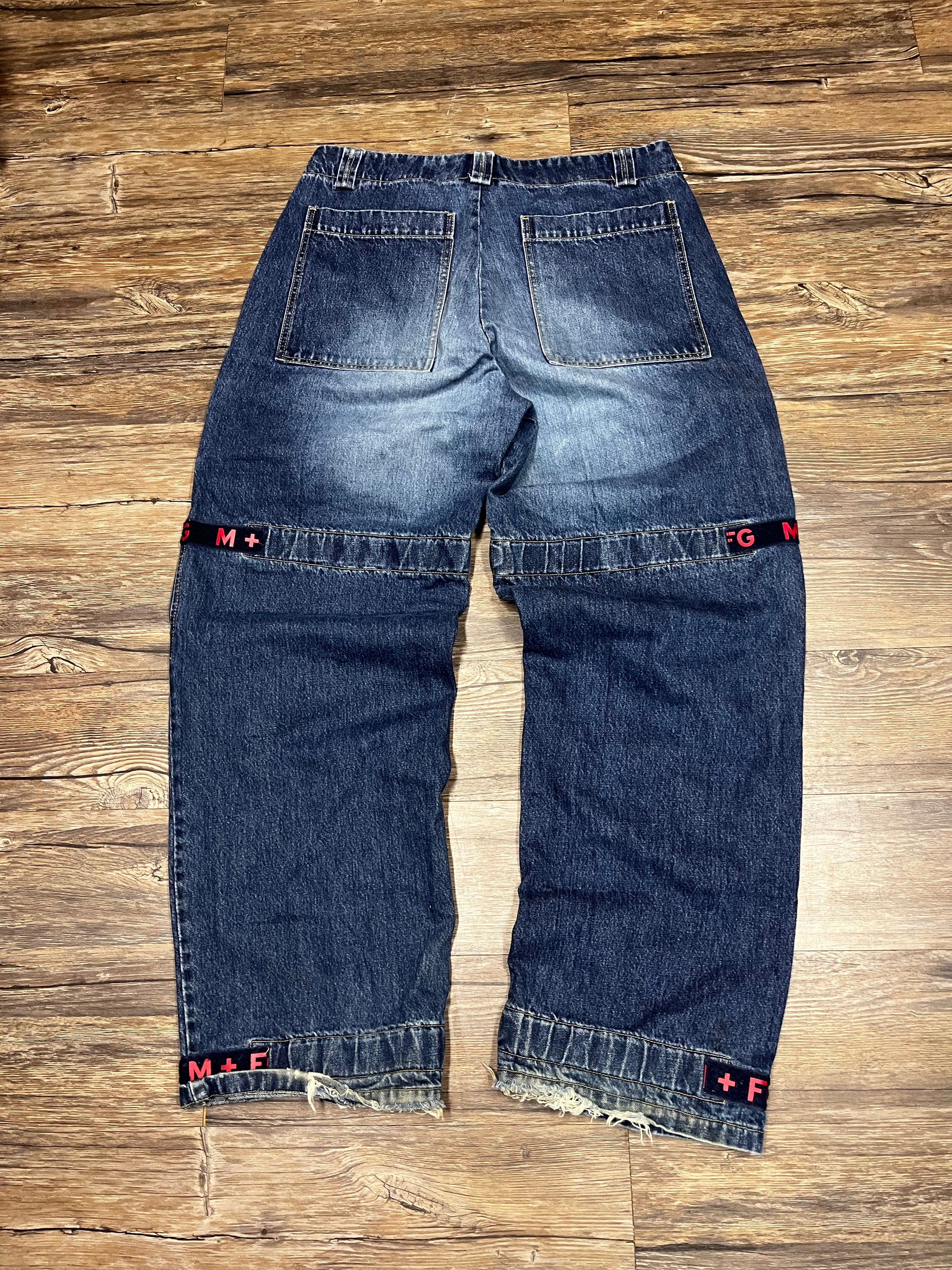 Sick pair of vintage Marithe Francois Girbaud denims with dark blue and red straps in a dark wash. In great condition, no stains or much visible damage.