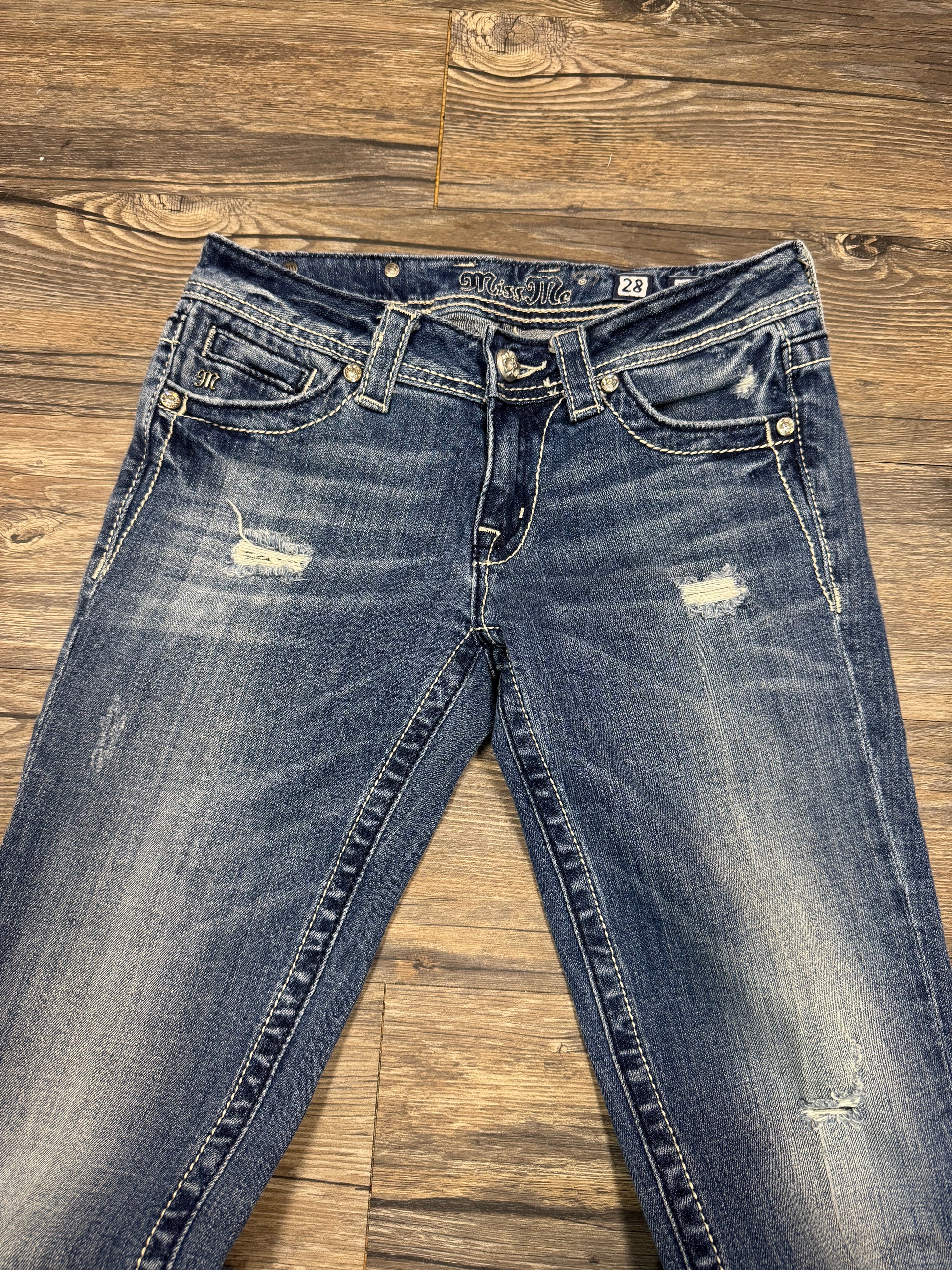 Super dope pair of MissMe jeans from the womans line. Dope back pocket detailing, great fading and distressing. Tagged size 18.