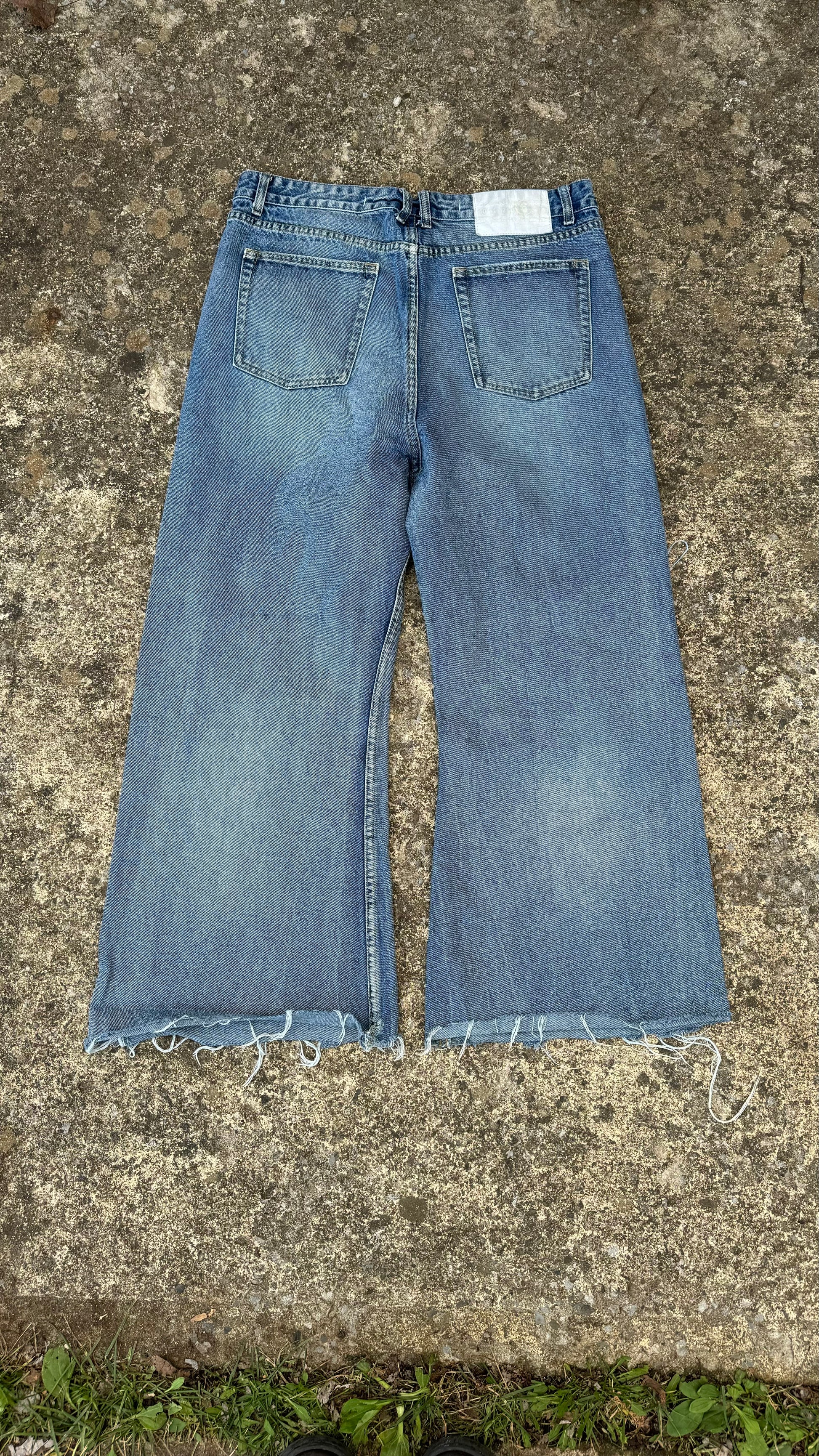 Insane pair of wide legged, distressed Margiela MM6 denims in mid-light wash. In great condition with no stains or wear besides the obvious.