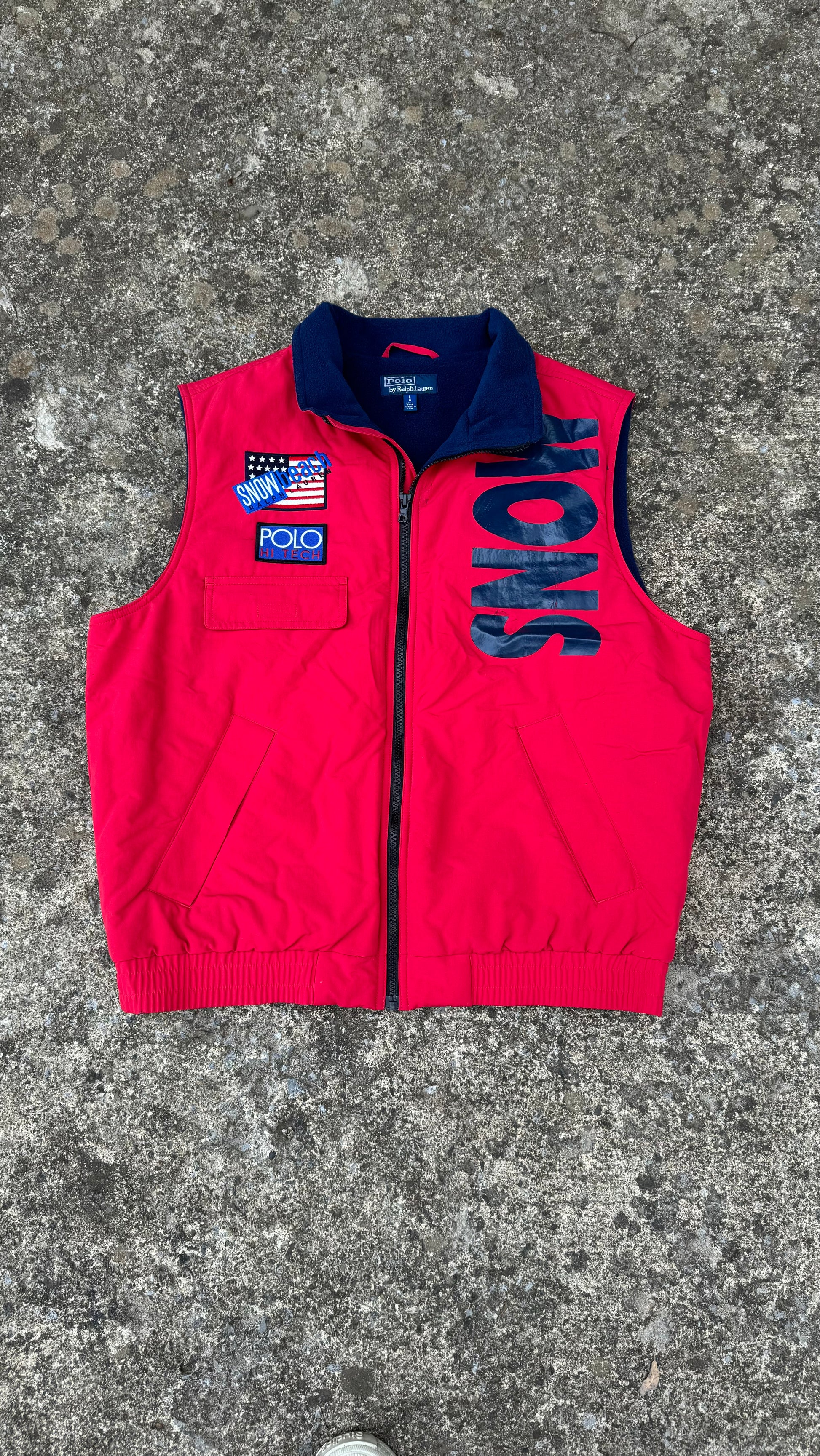 Insane vintage Polo Ralph Lauren Snow Beach vest with patches. An extremely rare Polo piece to find, with very few listings online. In amazing condition, little to no visible wear, stains, or damage.