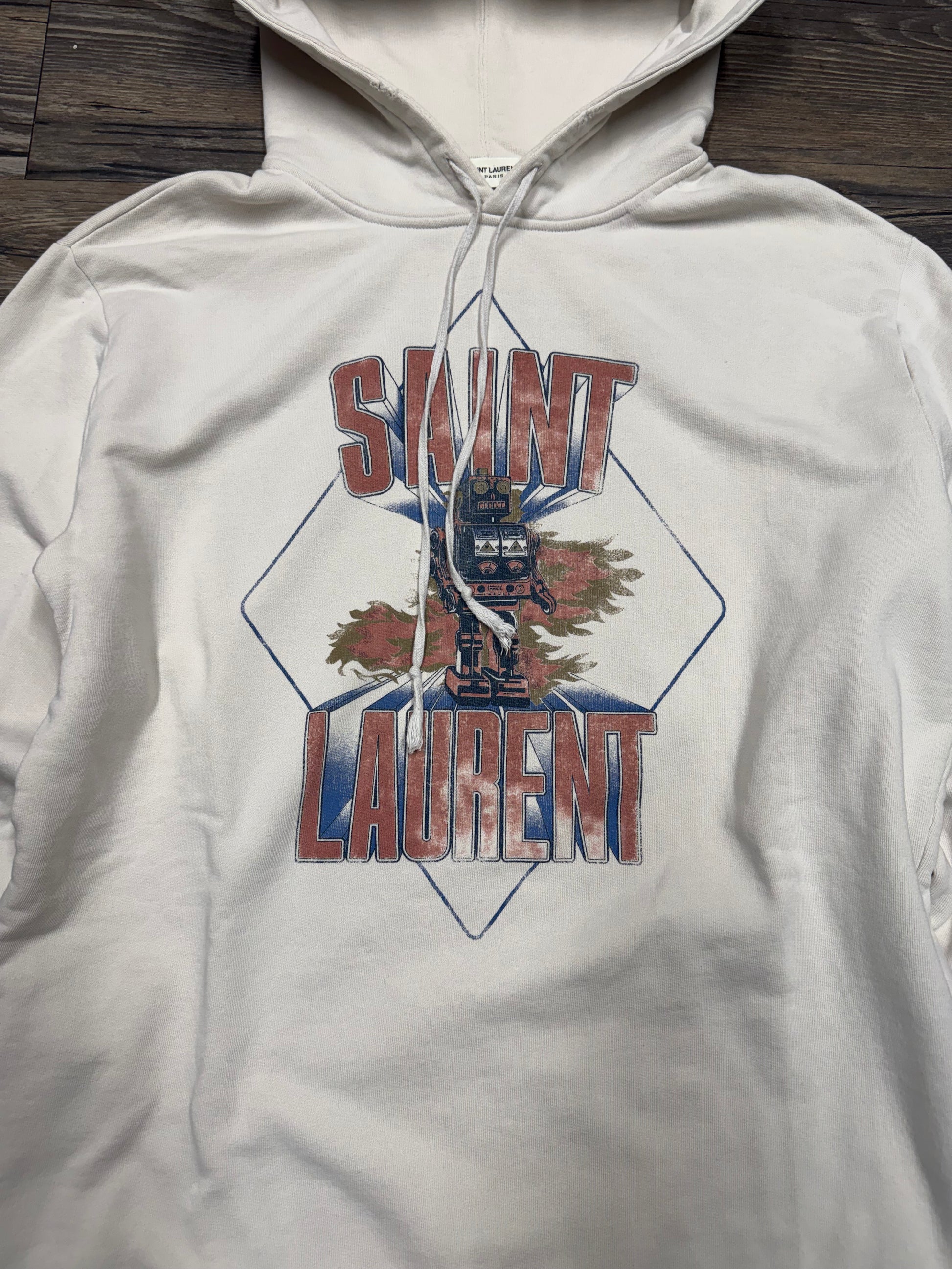 Sick hoodie from Saint Laurent with toy robot front graphic. In basically perfect condition, little to no signs of wear, staining, or damage.