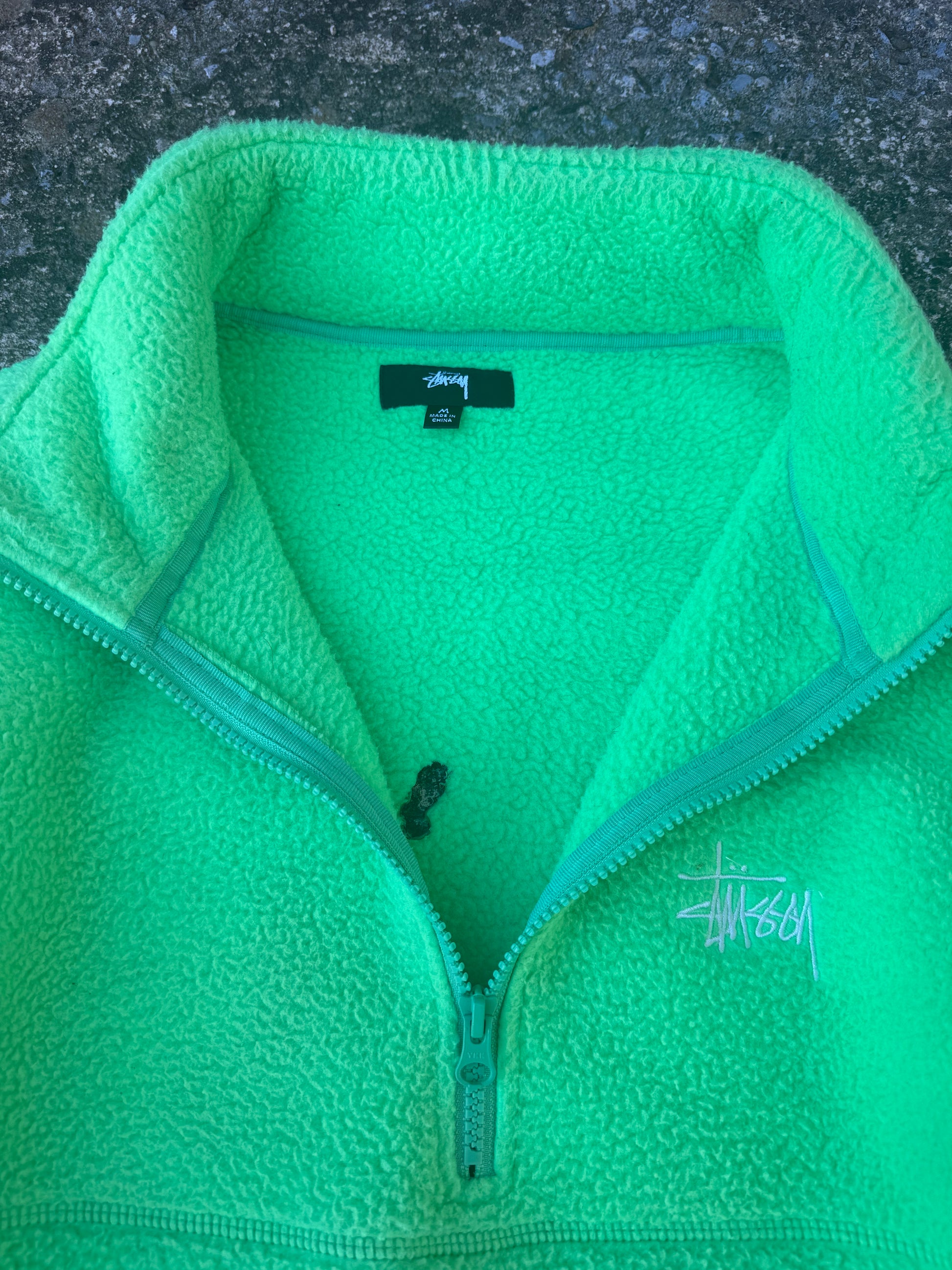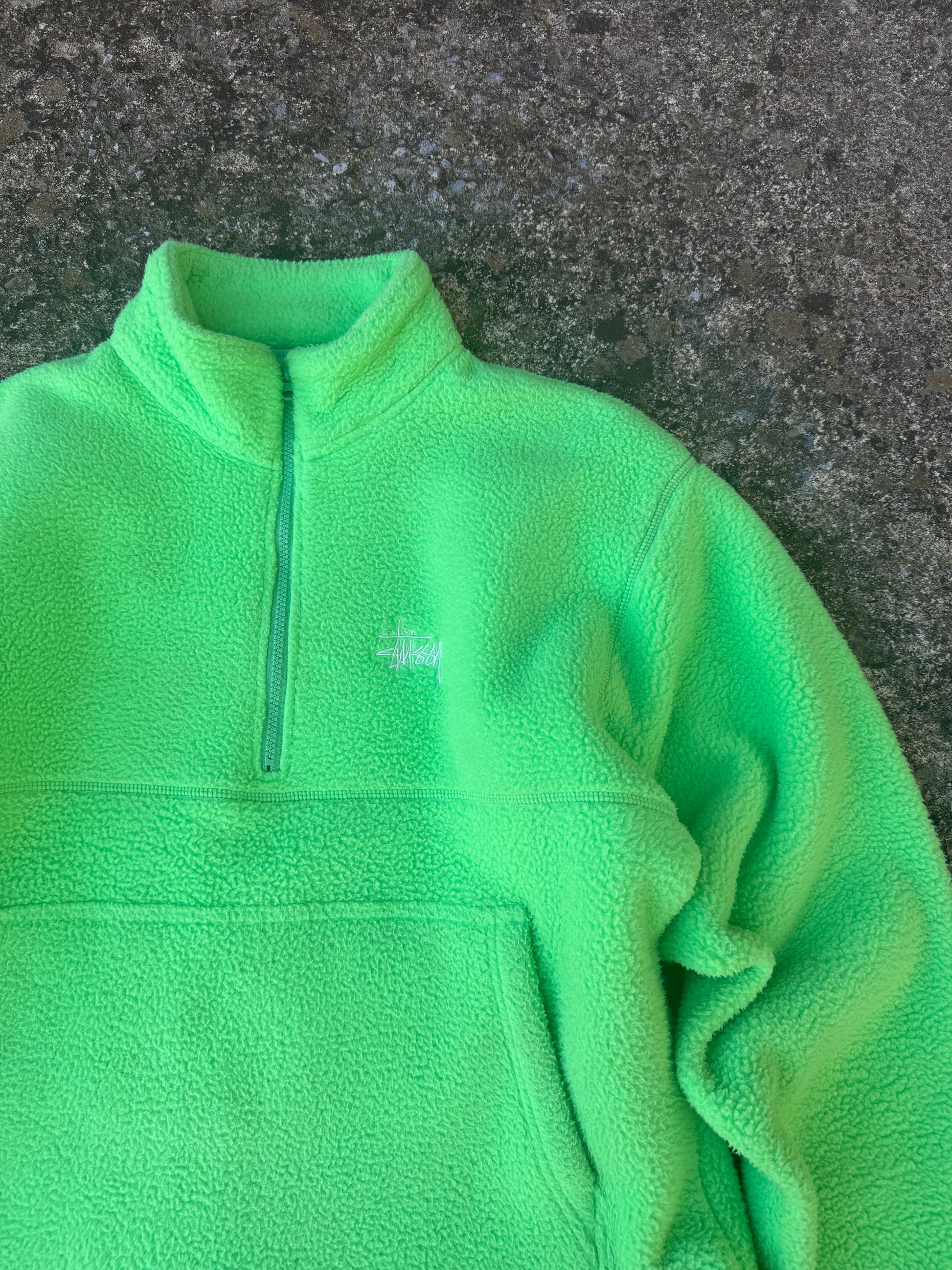 Sick lime green stussy half-zip fleece. In good condition besides a burn hole in the back, show in pictures. Great quality fleece with small logo embroidery on chest.
