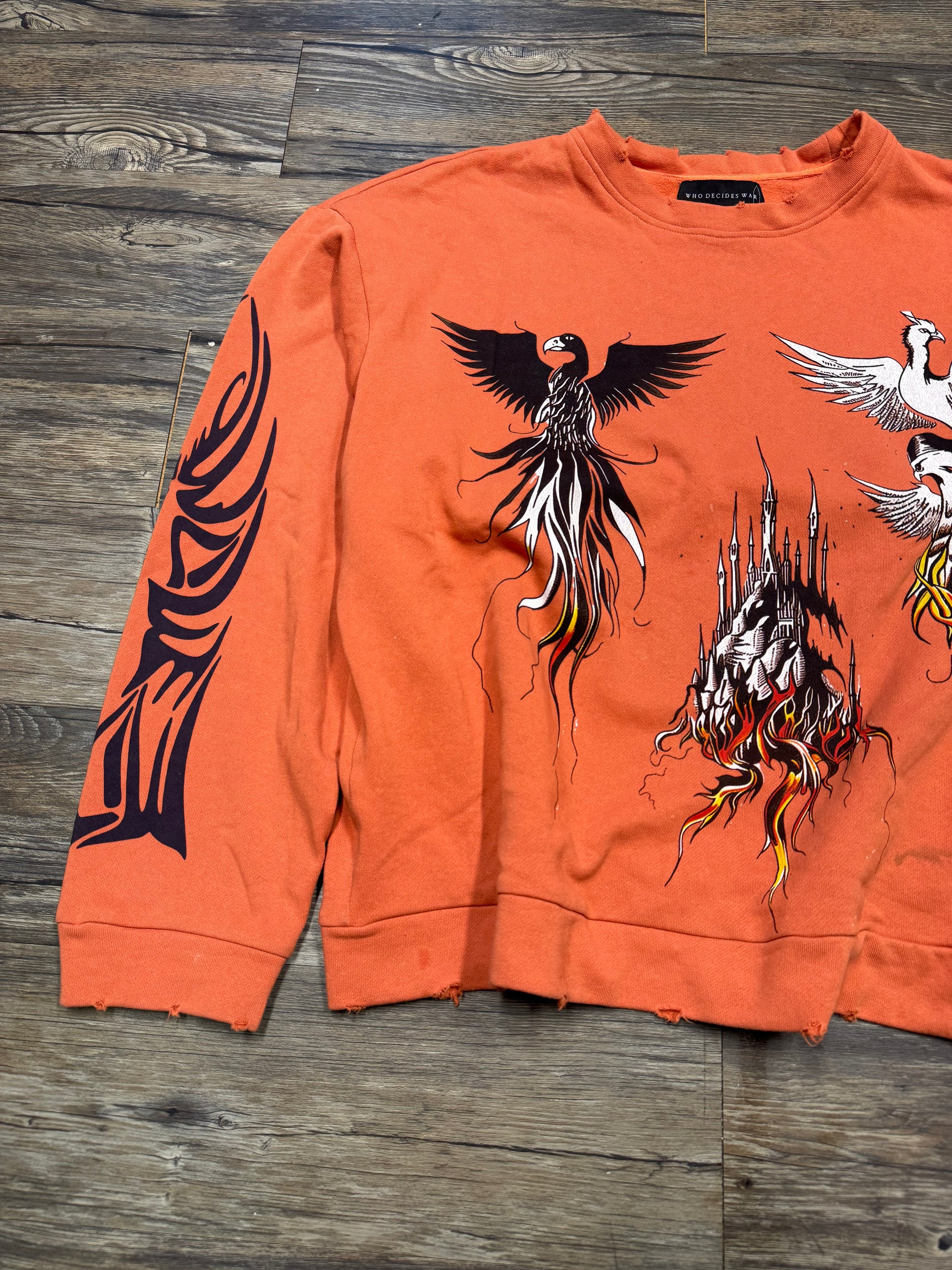Sick crewneck sweatshirt from Who Decides War, with graphics on the front, back, and down the sleeves. No signs of wear, staining, or damage.